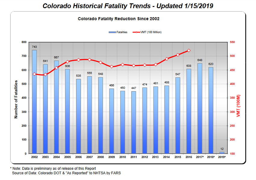 | 2018 | 620 | -4.3% | Four years into adult-use sales, net fatalities below 2002 despite rise in population and increased miles traveled |